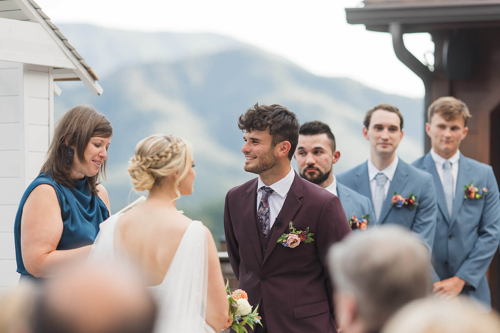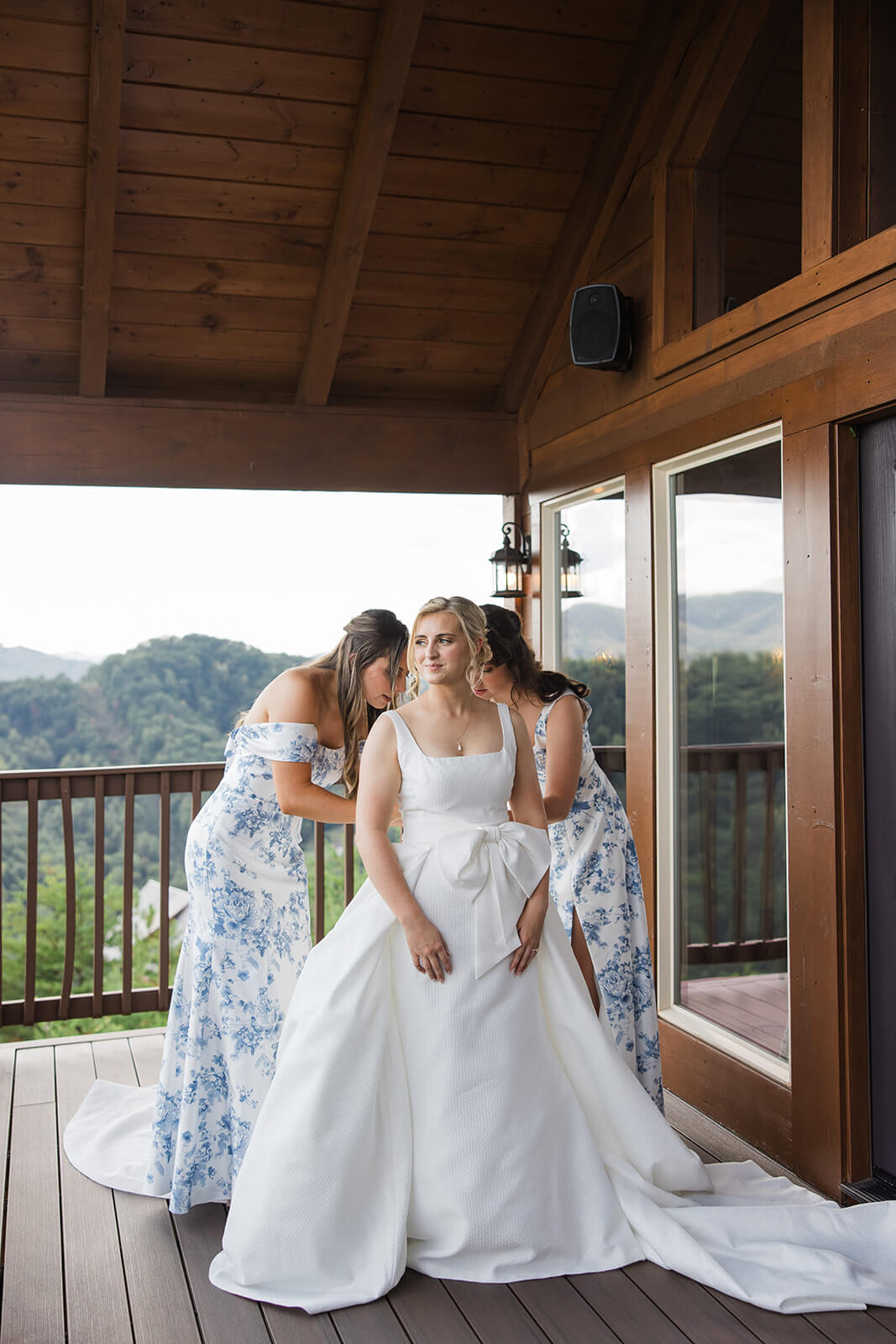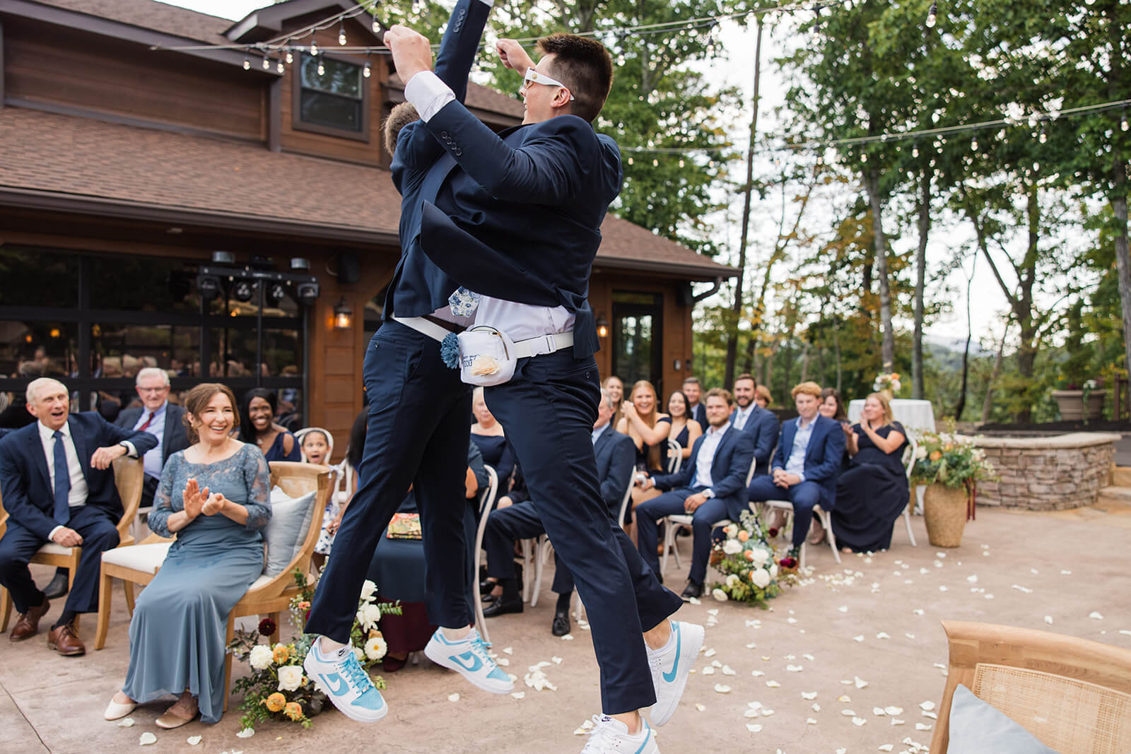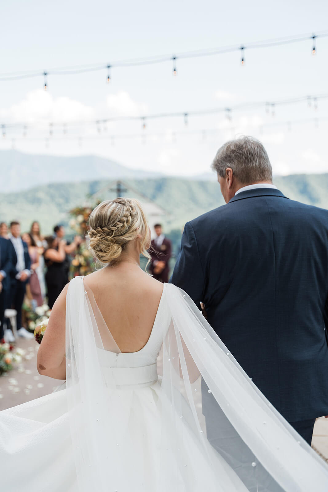 Guests in deep navy attire gathered on the open-air ceremony patio, framed by panoramic views of the Smokies. The arbor, which stood proudly against the mountain backdrop, resembled a white-washed chapel and was gorgeously decorated with a plethora of autumn-laced florals by Thistle & Lace.