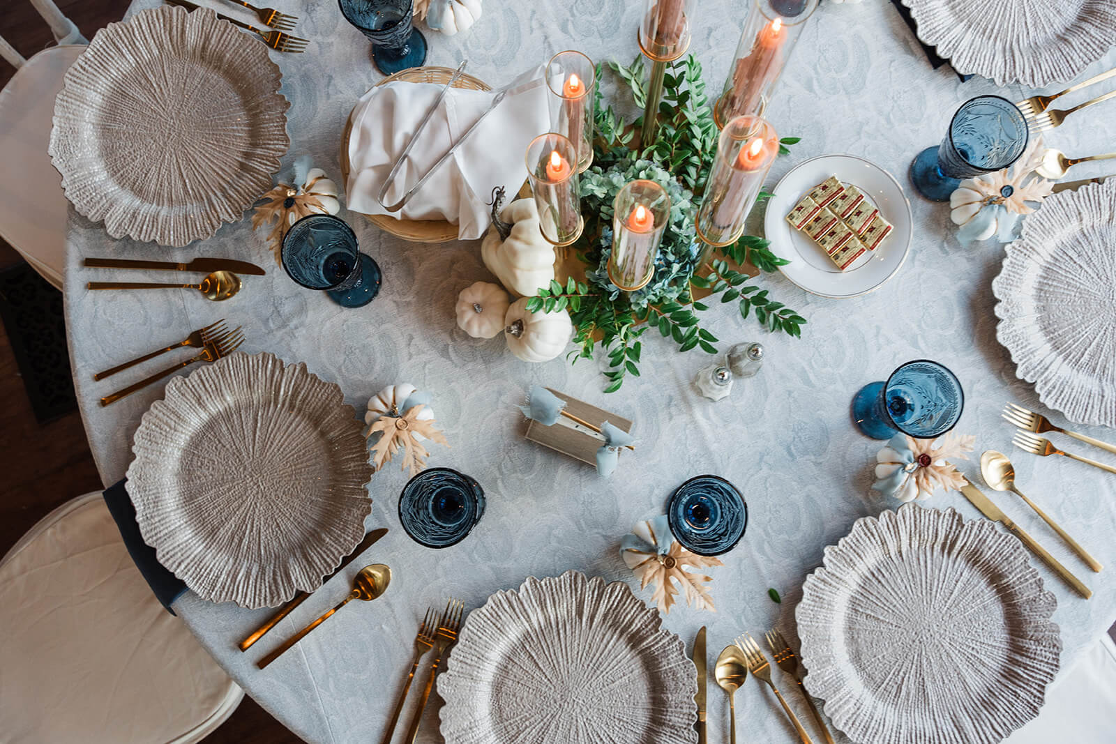 Stepping into the Grand Hall felt like entering a lush autumn dream. Designed by Dabney’s Designs with rentals from Marsh Made Design and Please Be Seated, the space exuded modern elegance and warmth. Deep rose-colored banquettes lined tables dressed in soft blue linens, while glowing candlelight illuminated the wood-planked ceiling. Florals cascaded from golden vessels in every shade of fall.